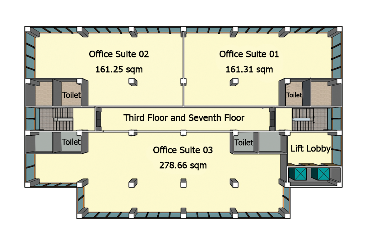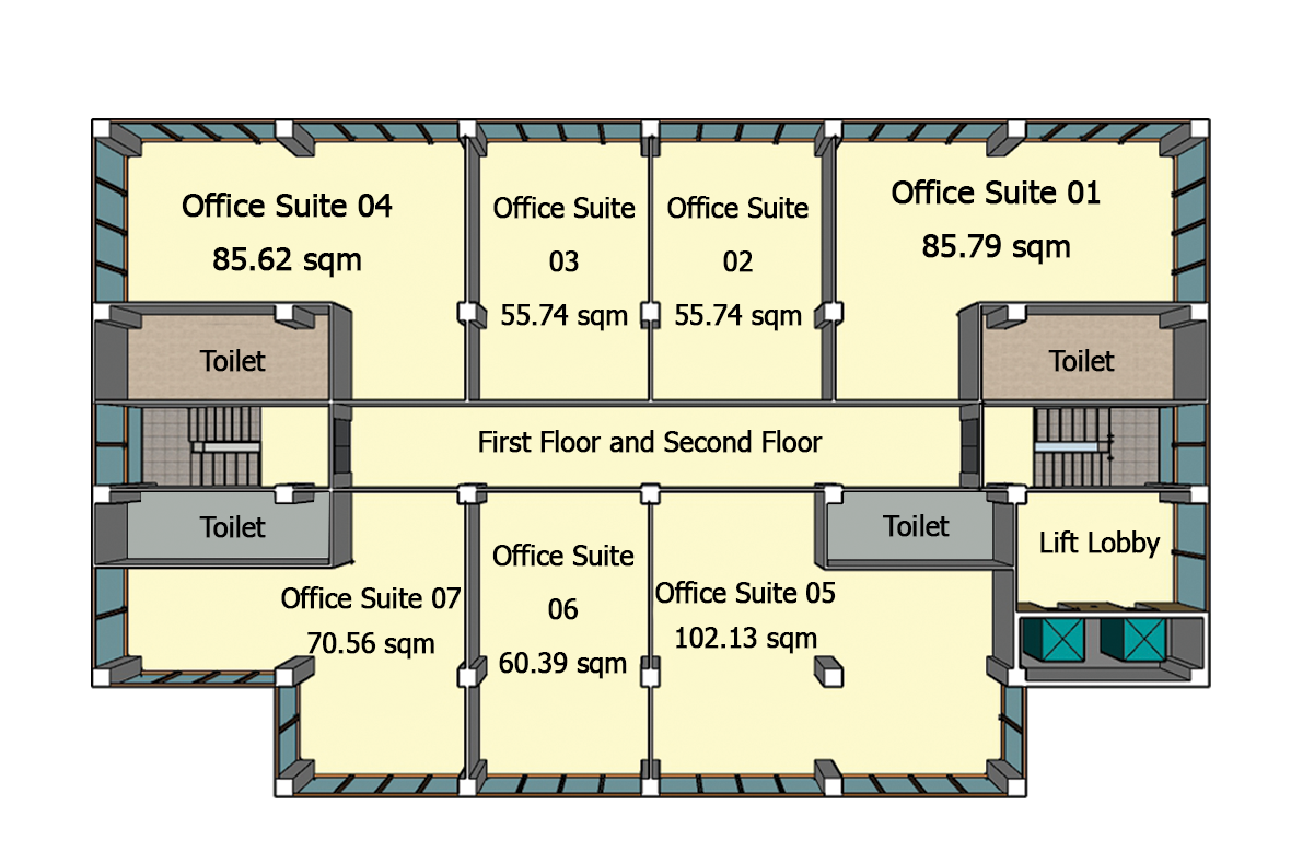 Units7 unitsOffice Suites02, 03, 06 55.74 sqm ~ 60.4 sqm – 6 to 10 peopleOffice Suites0770.56 sqm – 7 to 12 peopleOffice Suites0185.79 sqm – 9 to 14 peopleOffice Suites05102.13 sqm – 10 to 17 people