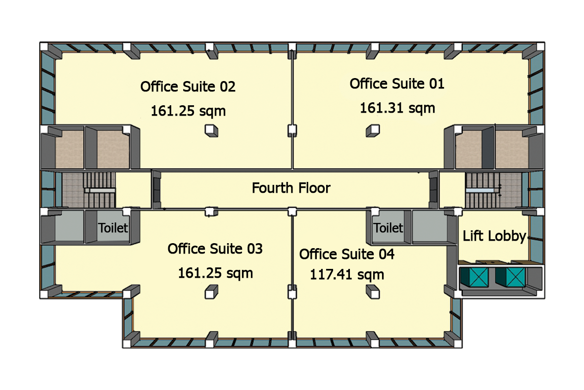 Units4 unitsOffice Suites01, 02, 03 161.3 sqm – 16 to 27 peopleOffice Suites04117.41 sqm – 12 to 20 people