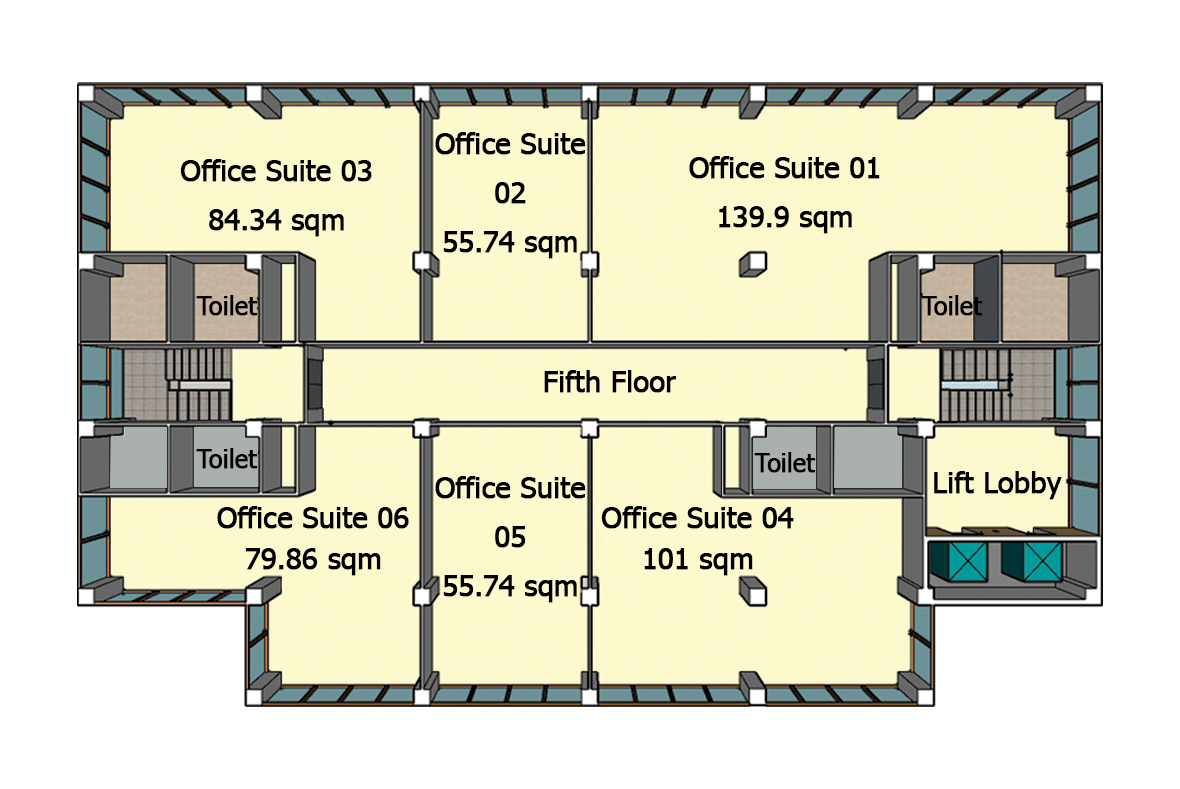 Units6 unitsOffice Suites02, 0555.74 sqm – 6 to 9 peopleOffice Suites03, 0679.86 sqm ~ 84.34 sqm – 8 to 14 peopleOffice Suites04101 sqm – 10 to 17 peopleOffice Suites01139.9 sqm – 14 to 23 people
