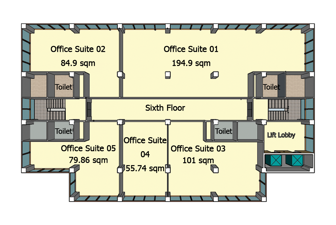 Units5 unitsOffice Suites0455.74 sqm– 6 to 9 peopleOffice Suites02, 0579.86 sqm ~ 84.9 sqm – 8 to 14 peopleOffice Suites03101 sqm – 10 to 17 peopleOffice Suites01194.9 sqm – 19 to 32 people